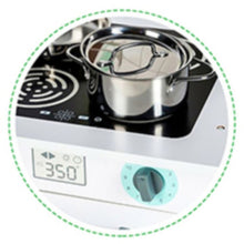 Komplektā ir iekļauti arī pieci virtuves piederumi (katls ar vāku, panna, lāpstiņa un kauss), lai uzlabotu rotaļu pieredzi. Visiem koka elementiem nav bīstamu malu.