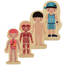 Puzles elementi tiek likti slāņos. Mazuļa uzdevums ir pareizā secībā salikt cilvēka skeletu, iekšējos orgānus, muskuļus, ķermeni un pašās beigās — apģērbu. Komplektā iekļautā koka pamatne lieti noderēs.