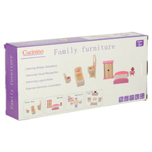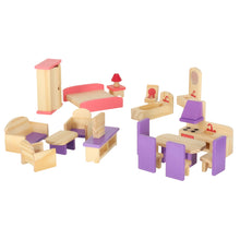 Šis koka mēbeļu komplekts ir radīts, lai lieliski papildinātu leļļu māju. Tas ietver mēbeles viesistabai, guļamistabai, vannas istabai un virtuvei, lai radītu reālistisku un funkcionālu interjeru lellēm.