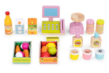 Komplektā ietilpst krāsaini dārzeņi, augļi un pārtikas produkti, piemēram, sulas, ievārījumi, piens un garšvielas – lieliski piemērots nosaukumu un krāsu apguvei. Pulkstenis un tāfele papildina funkcionalitāti. Tas ir lieliski piemērots lietošanai mājās, pirmsskolā un rotaļu istabās, veicinot lomu spēles un kopīgu rotaļāšanos.